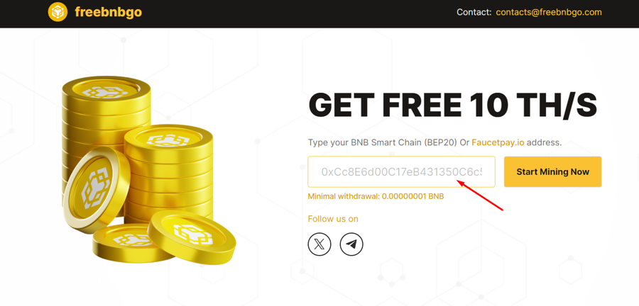 You do not need to register an account on Freebnbgo.com. Just paste the Metamask address and click Start Mining Now, you can earn free BNB.