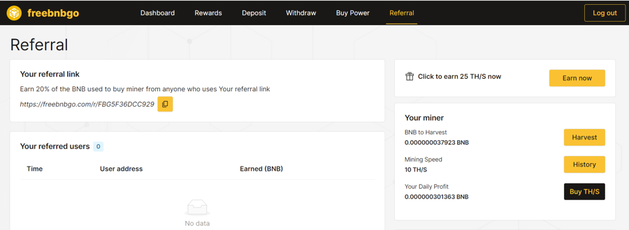 You will Earn 20% of the BNB used to buy miner from anyone who uses. You can find to your referral link on menu tab.